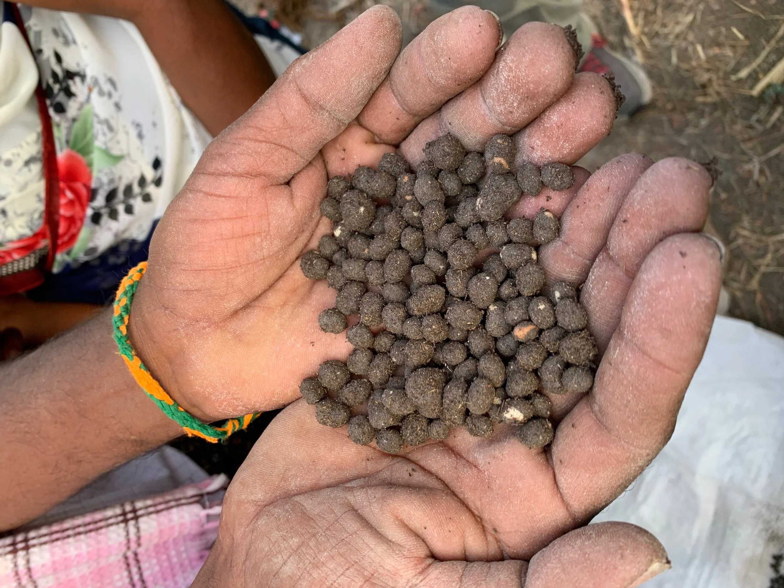 1: Coating dicot seeds with microbes from the manure of indigenous cattle – cow urine, ash, and lime is also part of this seed treatment mix.